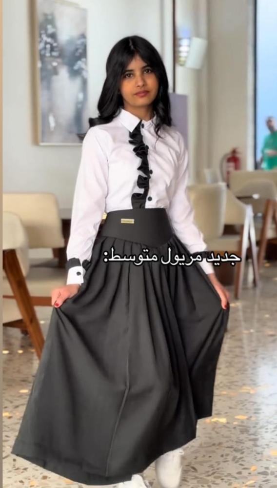 بلوزة بيضاء بأزرار وكشكش زيتي أنيق يضيف لمسة ناعمة، وتنورة بخصر عالي واسع بلون زيتي أنيق، مثالية للمدرسة ومريحة في اللبس.
