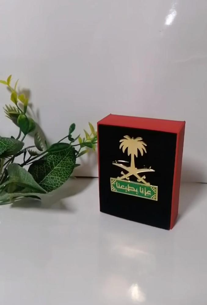 بروش أنيق بتصميم وطني فاخر يحمل شعار المملكة (النخلة والسيفين) مزخرف باللون الذهبي اللامع مع عبارة "عزنا بطاعتنا"، يجمع بين الفخامة والرمزية. يتميز بحجمه المناسب وثباته عند التثبيت، ليكون إضافة مثالية على العباية، الثوب أو حتى الشال في المناسبات الوطنية. خيار مميز لهدية قيمة تعبّر عن الانتماء والفخر بالوطن