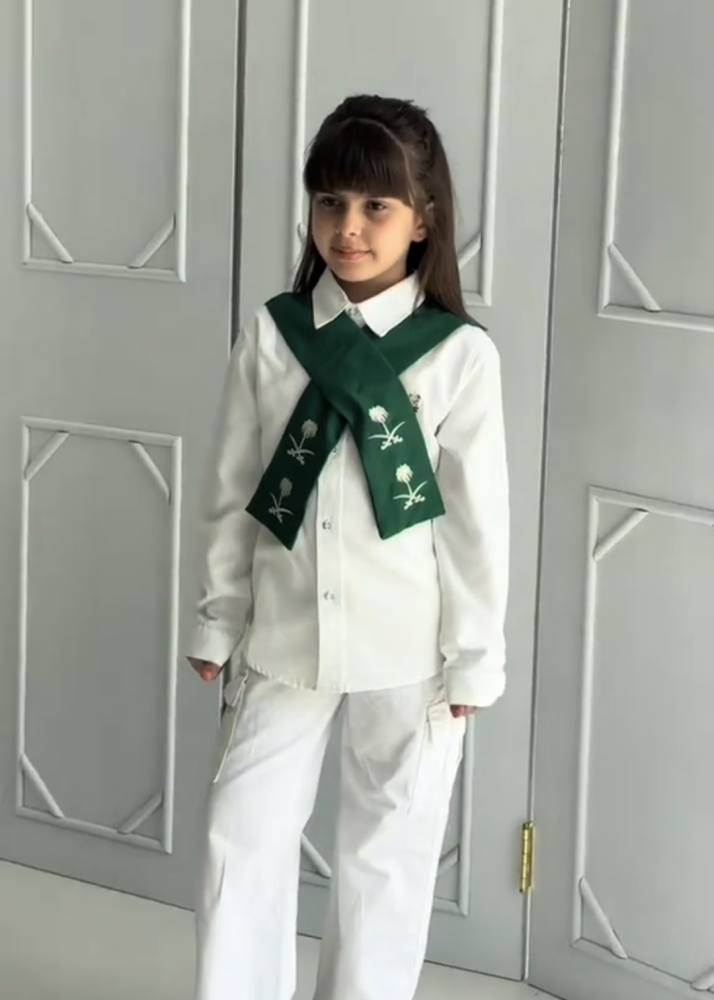 وشاح أنيق باللون الأخضر مزخرف بشعار المملكة العربية السعودية، يمنح طفلتك إطلالة وطنية جميلة ومميزة. خامة مريحة وخفيفة، يمكن ارتداؤه على الكتف أو ربطه على الرأس لإطلالة عصرية في اليوم الوطني. 💚🇸🇦