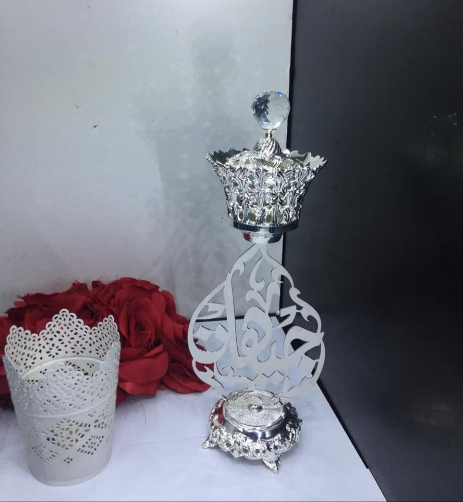 مبخره ملكي مطلي بالفضة بتصميم فاخر وانيق،وفي نحت بدقة متناهية لتضيف لمسه ملكيةوانيقة لديكور منزلكمتوفر باللون الذهبي و الفضيبإمكانك تغير الاسم حسب اختيارك